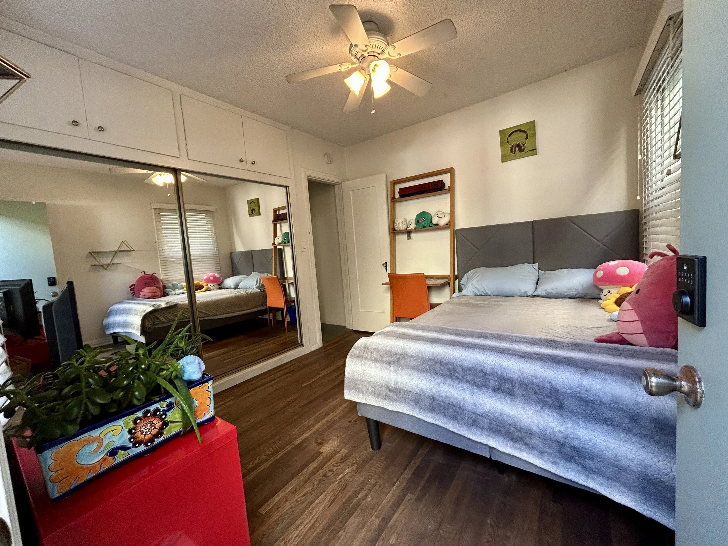The guest bedroom is a bright, private retreat designed for both comfort and functionality. Featuring a full-size bed with a plush memory foam mattress, it’s the perfect place to unwind after a day by the water. The room is furnished with a desk and chair, a TV, and a compact fridge for added convenience. Floor-to-ceiling mirrored closet add a sense of space and light, while two large windows fill the room with natural sunshine throughout the day.
