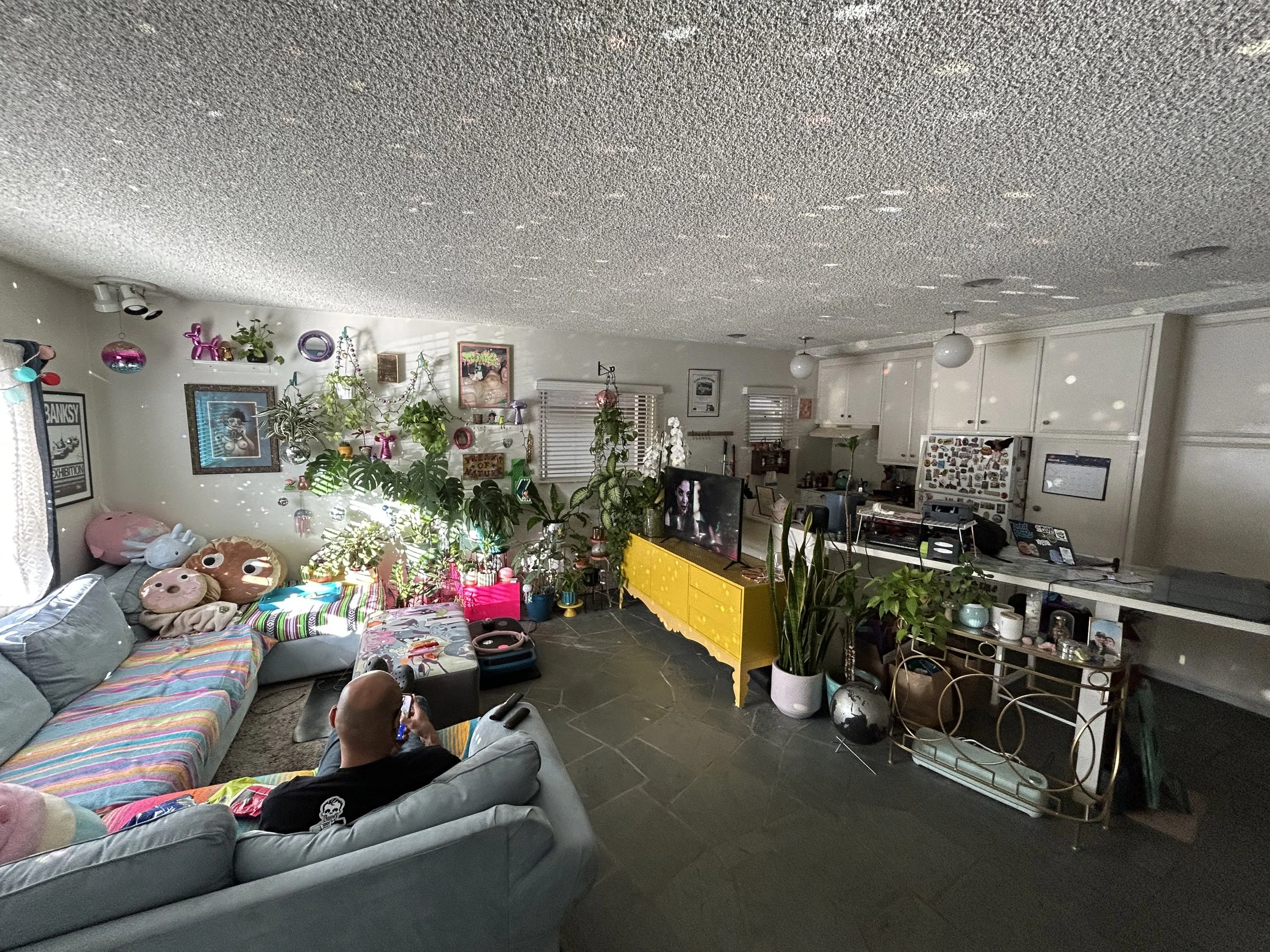 The living room is a playful mix of disco balls, lush plants, and a roomy wraparound couch.